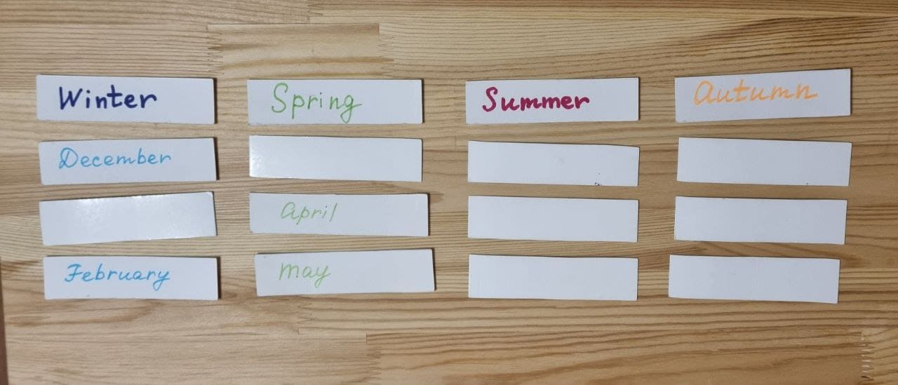 It is suitable for students who have previously studied this topic. Cards with the names of seasons and months are placed on the table face down. The student must recall the names of the months and, by turning over the cards, discover whether they remembered correctly or not. As a result, the full list of months should be formed. (pic 5).